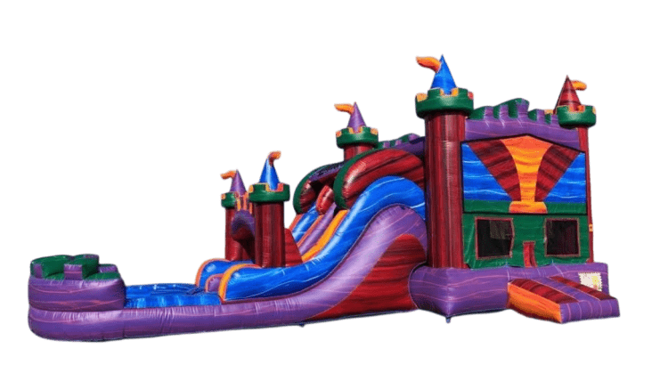 This massive palace-themed combo packs non-stop action with a spacious bounce area, climbing wall, and an exciting dual-lane slide that can be used wet or dry for year-round fun. Bright, bold colors and towering palace spires make it a show-stopper that kids and adults can’t miss.